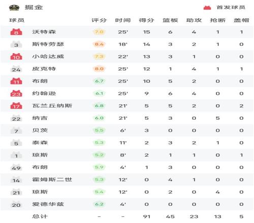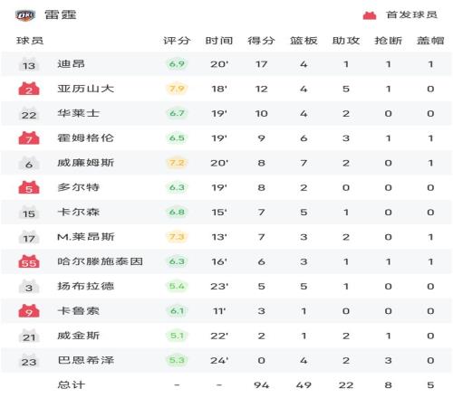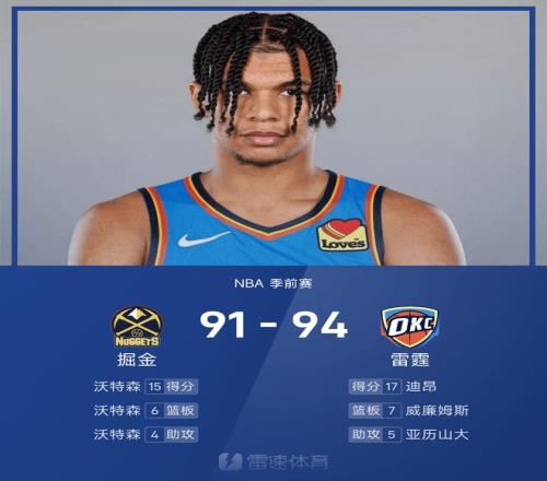 雷速体育10月18日宣 25/26赛季NBA 季前赛,雷霆对阵掘金。双方全场战罢,雷霆94-91战胜掘金。迪昂砍下全场最高的17分4板1助,率领雷霆成功取胜。