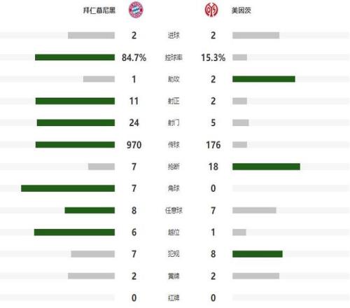 随着本场比赛的结束,拜仁对美因茨的主场八连胜和本赛季德甲全胜纪录被终结,但是他们德甲前十四轮联赛打进51粒进球,创造了联赛的历史,尽管没有拿到三分,但仍然在积分榜上遥遥领先稳居第一。