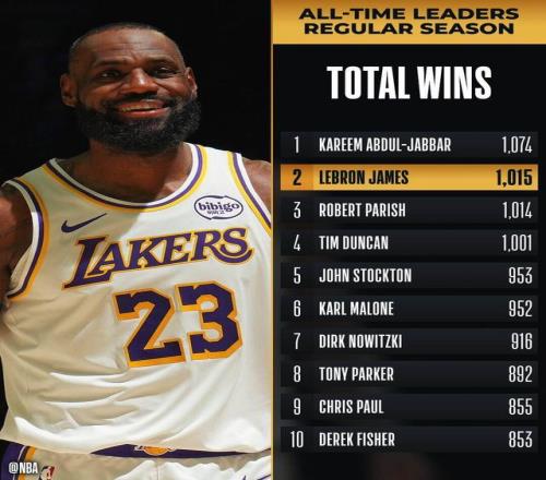 詹姆斯常规赛生涯总胜场数1015场超越帕里什升至历史第二