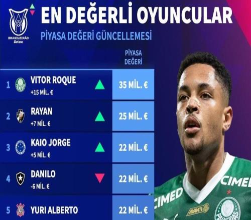北京时间12月11日,在更新了巴甲球员的身价之后,德转列出了目前巴甲身价排名前10的球员,目前效力于帕尔梅拉斯的巴塞罗那旧将维托尔-罗克身价暴涨1500万欧元,以3500万欧元排名第