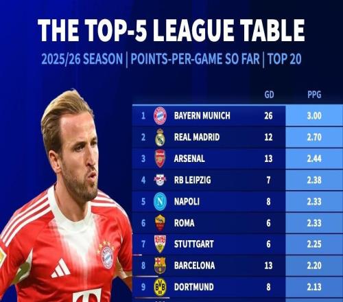 本赛季五大联赛场均积分:拜仁全胜第1,皇马、阿森纳二三位