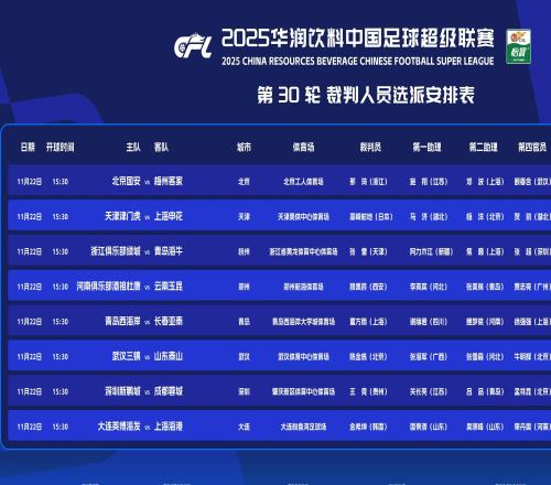 北京时间11月22日,中国足协公布中超最后一轮裁判安排:韩国籍裁判执法海港客战英博,日本籍裁判执法申花客战津门虎。本次中超主裁判的公布时间比往常晚了80分钟。足协官方公布主